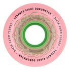 Ricta Wheel Dynamics 56mm, 78a Clouds Watermelon pink with green core and debossed and pad printed lettering. Super-soft urethane for cruiser setups and general transportation.